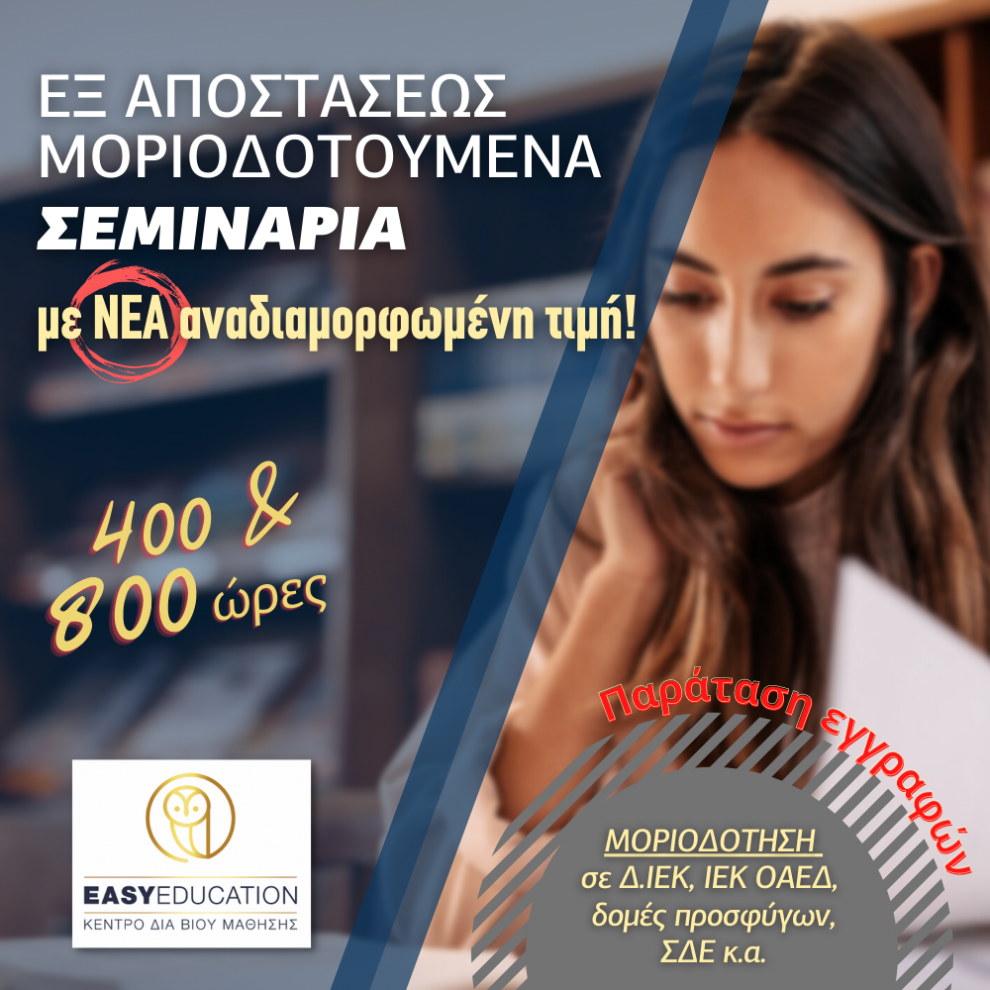 Τα Κέντρα Δια Βίου Μάθησης Επιπέδου Δύο, Easy-Education διοργανώνουν και υλοποιούν εξ αποστάσεως μοριοδοτούμενα σεμινάρια συνολικής παρακολούθησης 400 & 800 ωρών ΜΕ ΝΕΑ ΑΝΑΔΙΑΜΟΡΦΩΜΕΝΗ ΤΙΜΟΛΟΓΙΑΚΗ ΠΟΛΙΤΙΚΗ.