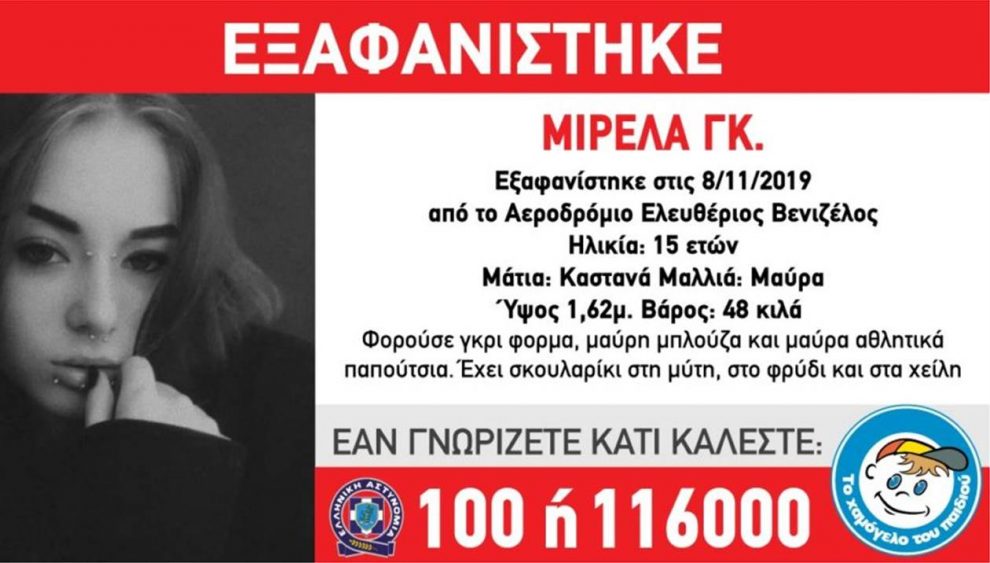 Όπως αναφέρει το «Χαμόγελο του Παιδιού» στην ανακοίνωση που εξέδωσε: «Στις 08/11/2019 και ώρα 14:00, εξαφανίστηκε από τον Διεθνή Αερολιμένα Αθηνών «Ελευθέριος Βενιζέλος», η Μιρέλα Γκ., 15 ετών.