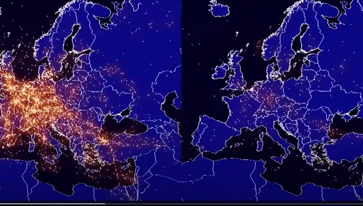 Χαρακτηριστικό της κατάστασης με την εξαφάνιση των πτήσεων στην Ευρώπη, είναι το βίντεο πού έδωσε στην δημοσιότητα η Eurocontrol, στο οποίο επιχειρείται μια σύγκριση στις πτήσεις ανάμεσα στον φετινό και τον περσινό Απρίλιο.