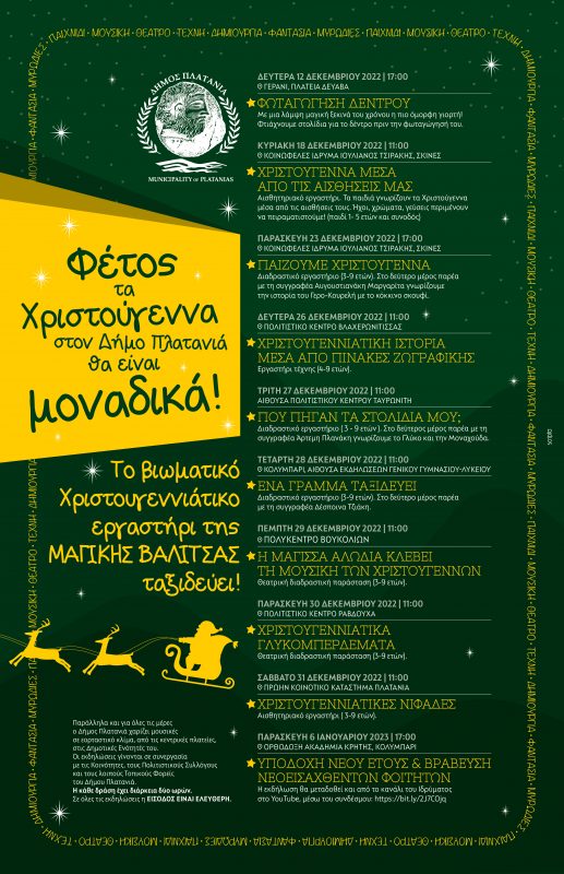 Παράλληλα και για όλες τις μέρες ο Δήμος Πλατανιά χαρίζει μουσικές σε εορταστικό κλίμα, από τις κεντρικές πλατείες, στις Δημοτικές Ενότητες του.