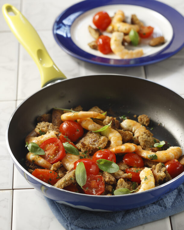Εκτέλεση: Καθαρίζουμε τις γαρίδες από τα κεφάλια και τα κελύφη. Μοιράζουμε τα υλικά σε 2 – 3 δόσεις. Θα τα τηγανίσουμε λίγα – λίγα σε μέτριο τηγάνι ή σε σαγανάκι, για να ψηθούν γρήγορα και να μη μείνουν πολλή ώρα στη φωτιά. Για κάθε τηγανιά ρίχνουμε από 1 κουτ. σούπας ελαιόλαδο και σοτάρουμε λίγο σκόρδο σε μέτρια φωτιά για 20 δευτερόλεπτα. Προσθέτουμε ντοματίνια, τα αλατίζουμε και τα σοτάρουμε για 3 – 4 λεπτά, ανακατεύοντας με μια ξύλινη κουτάλα, μέχρι να ιδρώσουν και να αρχίσουν να βγάζουν υγρά. Προσθέτουμε και τις γαρίδες και τις ψήνουμε για 1 – 2 λεπτά, ανακατεύοντας συνεχώς. Τέλος, ρίχνουμε το βασιλικό και τον ντάκο, που θα τραβήξει τα υγρά του τηγανιού. Αλατοπιπερώνουμε και σερβίρουμε. Επαναλαμβάνουμε την ίδια διαδικασία με τα υπόλοιπα υλικά.