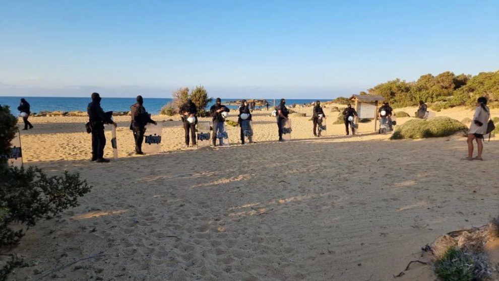 Η παρουσία των ΜΑΤ και συνεργείων με αλυσοπρίονα προκάλεσε την οργισμένη αντίδραση κατοίκων, παραθεριστών και της συλλογικότητας Gavdos SeaFront Collective