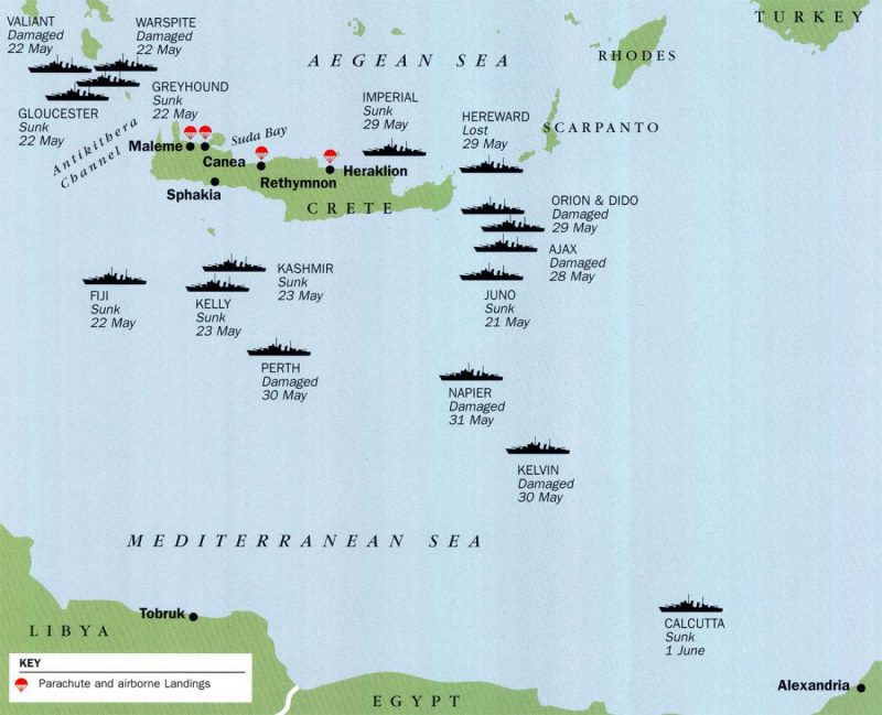 27 Μαΐου 1941 Ο Αρχιστράτηγος της Μέσης Ανατολής Ουέιβελ στέλνει μήνυμα να εκκενωθεί το νησί από τις συμμαχικές δυνάμεις. Για τη διάσωση και μεταφορά τους στέλνονται πλοία του βρετανικού Στόλου. Τα Χανιά περιέρχονται στα χέρια των εισβολέων.