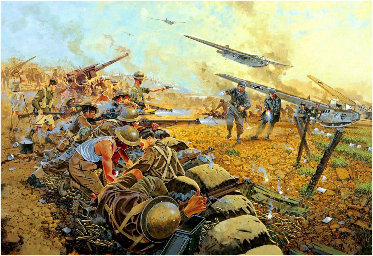 20 Μαΐου 1941 Την 6:30 πρωινή αρχίζει η γερμανική επίθεση. Βομβαρδίζονται και ρίχνονται αλεξιπτωτιστές στα Χανιά, στο Ρέθυμνο και το Ηράκλειο. Σημειώνονται κατά τόπους συγκρούσεις των Γερμανών αλεξιπτωτιστών με τα συμμαχικά στρατεύματα, τα οποία ενισχύονται από τον ντόπιο πληθυσμό.