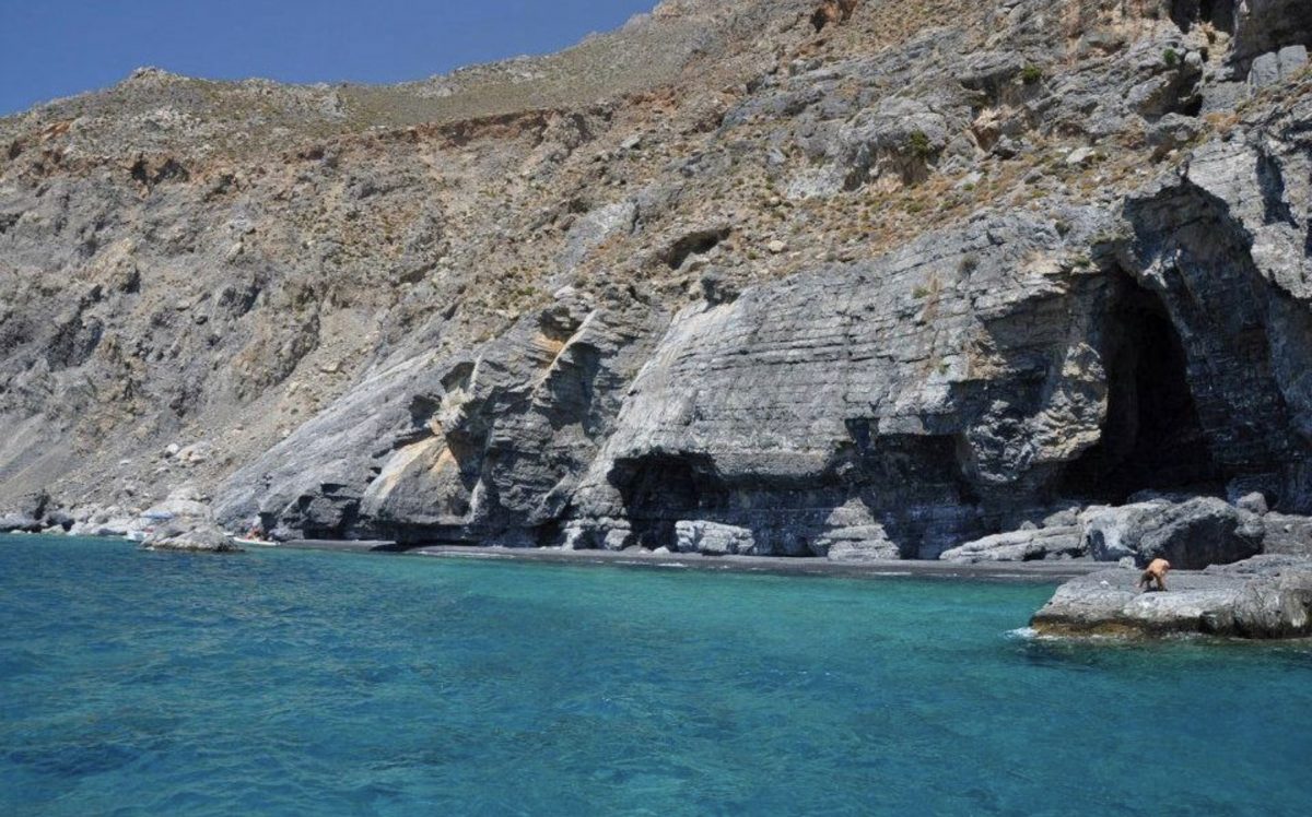 Μέλη του Ορειβατικού Μοιρών επισκέφθηκαν την τόσο απομονωμένη αυτή περιοχή, όπου η πρόσβαση είναι εφικτή μόνο με σκάφος, σε ένα τοπίο με ιδιαίτερα βράχια (όπως αυτό που δείχνουμε με βέλος και θυμίζει ανθρώπινο πρόσωπο), απολαμβάνοντας σαν μικρά παιδιά, το μπάνιο τους στα κρυστάλλινα νερά, όπως κατέγραψε ο φακός του ορειβάτη Μανώλη Ντρετάκη…