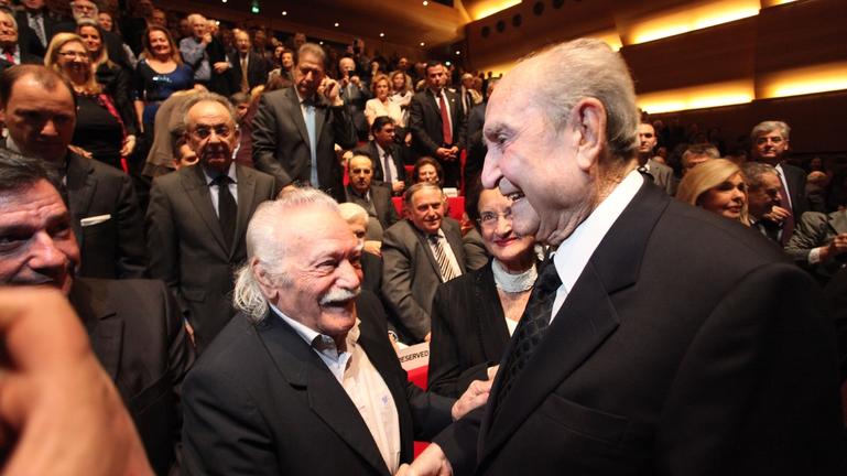 Παρά τα 91 του – τότε – χρόνια και το χιονόνερο που έπεφτε ο Μανώλης Γλέζος έσπευσε να επισκεφθεί τον επίτιμο πρόεδρο της ΝΔ και να του ευχηθεί περαστικά.