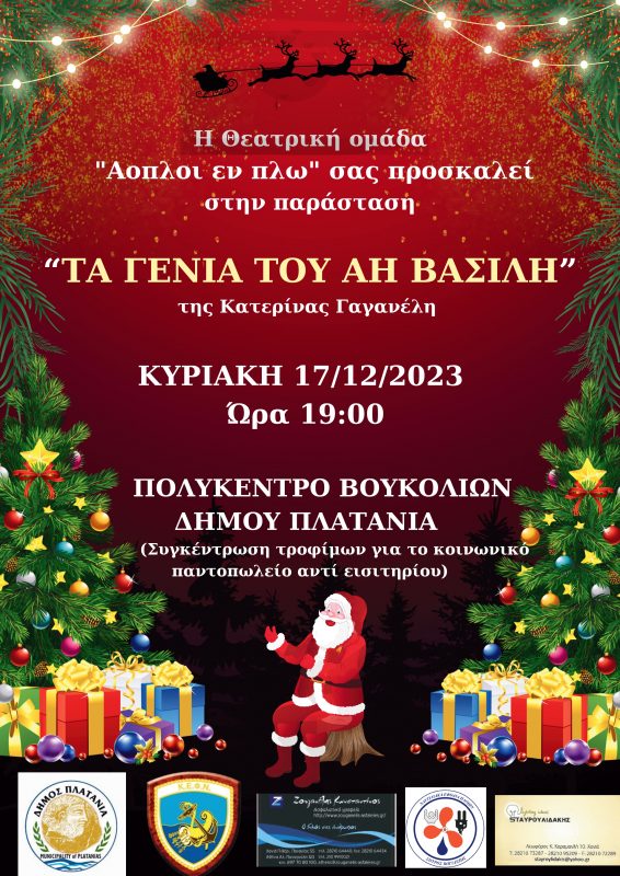 Η θεατρική ομάδα «Άοπλοι εν Πλω» παρουσιάζει, με τη στήριξη του Δήμου Πλατανιά, την παιδική θεατρική παράσταση «ΤΑ ΓΕΝΙΑ ΤΟΥ ΑΗ ΒΑΣΙΛΗ» της Κατερίνας Γαγανέλη, την Κυριακή 17 Δεκεμβρίου, στις 19.00, στο Πολύκεντρο Βουκολιών.