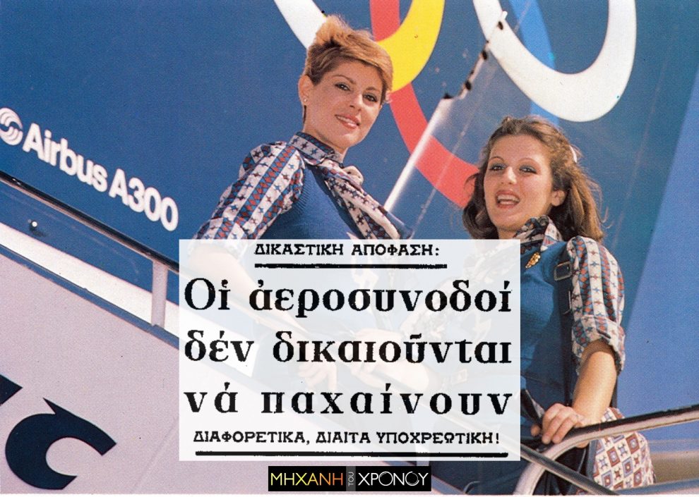 «Οι αεροσυνοδοί οφείλουν να διατηρούν τη σιλουέτα τους. Κι αν οι ίδιες την παραμελούν, τότε η Αεροπορική Εταιρεία έχει το δικαίωμα να αξιώσει από αυτές να αποβάλουν τα περιττά κιλά.» Η πρωτοφανής δικαστική απόφαση του Μονομελούς Πρωτοδικείου Αθηνών έκανε το γύρο των εφημερίδων τον Οκτώβριο του 1971. Σύμφωνα με τον δικαστή, σε περίπτωση που κάποια αεροσυνοδός πάχαινε, η αεροπορική εταιρεία δικαιούνταν να την υποβάλει σε υποχρεωτική δίαιτα.