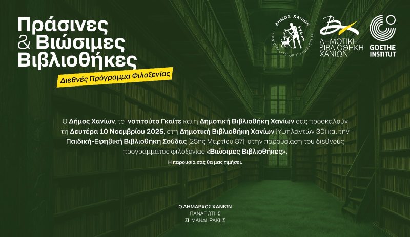 Ο Δήμος Χανίων και η Δημοτική Βιβλιοθήκη Χανίων συμμετέχουν στο διεθνές πρόγραμμα φιλοξενίας «Βιώσιμες Βιβλιοθήκες» του Ινστιτούτου Γκαίτε, ως οι μοναδικοί εκπρόσωποι της Ελλάδας στο πλαίσιο του ευρωπαϊκού δικτύου «Goethe-Institut Europe I».