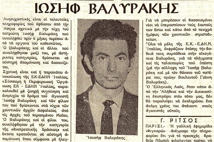 “Ουδέν ίχνος μέχρι στιγμής από τον Ιωσήφ Βαλυράκη, τον νεαρό πολιτικό κατάδικο, ο οποίος τις πρώτες πρωινές ώρες του Σαββάτου απέδρασε κατά μυθιστορηματικό τρόπο από τις φυλακές της Κέρκυρας όπου εκρατείτο”.