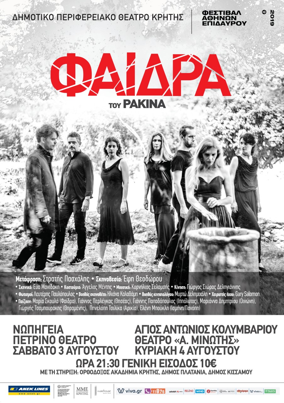 Το Δημοτικό Περιφερειακό Θέατρο Κρήτης σε συμπαραγωγή με το Φεστιβάλ Αθηνών και Επιδαύρου παρουσιάζει την κλασική τραγωδία του Ρακίνα Φαίδρα, αριστούργημα του γαλλικού 17ου αιώνα, που αντλεί τις πηγές της από τον Πλούταρχο και τον Βιργίλιο και εμπνέεται το θέμα της από τα έργα Ιππόλυτος του Ευριπίδη και Φαίδρα του Σενέκα, σε σκηνοθεσία της Έφης Θεοδώρου.
