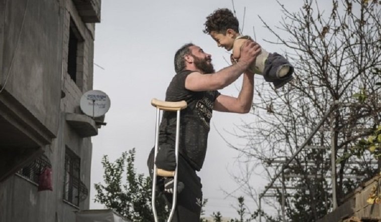 Ο λόγος για τον οποίο συγκλονίζει αυτή η φωτογραφία είναι ότι ο Μουνζίρ έχασε το δεξί του πόδι όταν έπεσε βόμβα ενώ περπατούσε σε παζάρι στην Ιντλίμπ της Συρίας. Ο γιος του Μουσταφά γεννήθηκε χωρίς κάτω και άνω άκρα λόγω συγγενούς διαταραχής, της τετραμελίας, καθώς η μητέρα του Ζεϊνέπ έπρεπε να πάρει φάρμακα αφού εκτέθηκε σε νευρικό αέριο στη διάρκεια του πολέμου στη Συρία.