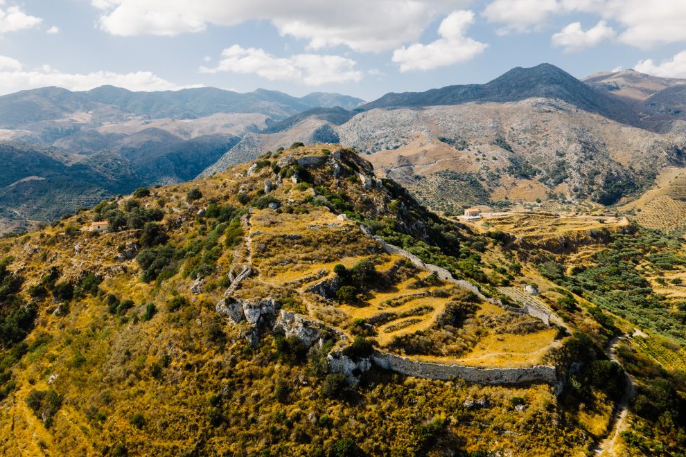 Μετά από 1.200 μέτρα ανηφορικού δρόμου, η διαδρομή καταλήγει στην αρχαία Πολυρρήνια, χτισμένη σε υψόμετρο 418 μέτρων με πανοραμική θέα από το Κρητικό ως το Λιβυκό. Η πόλη υπήρξε από τις ισχυρότερες της Δυτικής Κρήτης, με ιστορία από τη Μινωική έως τη Ρωμαϊκή εποχή. Η ακρόπολη περιβαλλόταν από κυκλώπεια τείχη, ενώ το όνομά της («πολλά πρόβατα») υποδηλώνει τον ποιμενικό της πλούτο που χρηματοδότησε τον στρατό και τις οχυρώσεις της. Σώζονται ρωμαϊκά και βυζαντινά κατάλοιπα, καθώς και το εκκλησάκι των Αγίων Πατέρων, χτισμένο το 1894 με υλικά από τον αρχαίο ναό της Δικτύννης Αρτέμιδος.