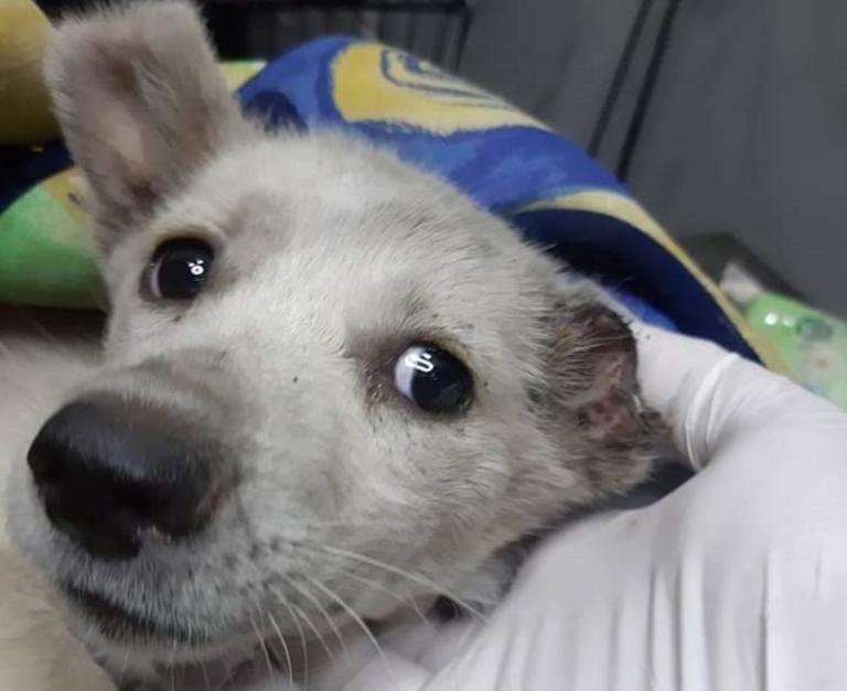 Το άτυχο σκυλάκι, μόλις δύο μηνών, βρέθηκε με ακρωτηριασμένο πόδι και αυτιά, ενώ είχε και με μαχαιριές στο σώμα του.