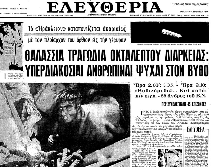 Στις 2.06 τα ξημερώματα της 8ης Δεκεμβρίου του 1966 το οχηματαγωγό πλοίο “Ηράκλειον” της εταιρείας των αδελφών Τυπάλδου εξέπεμψε S.O.S από το Αιγαίο Πέλαγος, στο ύψος της Φαλκονέρας, 25 μίλια βορειοδυτικά της Μήλου. Μέσα σε ελάχιστο χρονικό διάστημα -ούτε δέκα λεπτά- το πλοίο βυθίστηκε και παρέσυρε μαζί του κάπου 300 ψυχές. Ο ακριβής αριθμός των θυμάτων δεν έγινε ποτέ γνωστός. Μόλις 47 ήταν οι επιζώντες, σε μια μάλλον καθυστερημένη και σίγουρα όχι τόσο καλά οργανωμένη επιχείρηση διάσωσης.