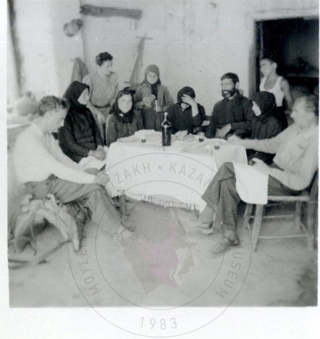 Το σπίτι του ήταν εκεί δίπλα σε μιαν κατηφοριά. Μπαίνομε μέσα, τί να δούμε, ένα τραπέζι, μ’ όλα του Θεού τα καλά, και στη γωνιά μια γυναίκα μαυροφορεμένη μ’ ένα κοριτσάκι μικρό στην ποδιά της, να κάθεται να κλαίει…