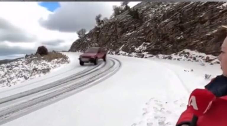 Την ώρα μάλιστα, που η δημοσιογράφος εφιστούσε την προσοχή των οδηγών λόγω της αυξημένης χιονόπτωσης στην περιοχή, ο οδηγός αγροτικού «έσκασε» στο πλάνο με γκαζιές. Μάλιστα, «χαιρέτησε» το συνεργείο παίζοντας την κόρνα, δίπλα σε επικίνδυνο γκρεμό (!), αφήνοντας την γυναίκα με ανοικτό το στόμα.