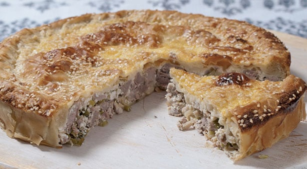 Εκτέλεση: Πλένουμε και βράζουμε το κρέας στο νερό για μία ώρα. Το ξεκοκαλίζουμε, το βάζουμε σε μια πιατέλα και το αλατοπιπερώνουμε. Ανοίγουμε φύλλο πάχους μισού εκατοστού χρησιμοποιώντας το αλεύρι, το γιαούρτι και το βούτυρο. Απλώνουμε το φύλλο στο ταψί, το βουτυρώνουμε και βάζουμε από πάνω μία στρώση μυζήθρα με τη μισή στάκα και λίγο δυόσμο. Τοποθετούμε τα κομμάτια του κρέατος πάνω στη μυζήθρα, βάζουμε μια δεύτερη στρώση μυζήθρα και στάκα και τον υπόλοιπο δυόσμο στο κρέας και τα σκεπάζουμε μ’ ένα δεύτερο φύλλο. Ενώνουμε το πάνω με το κάτω φύλλο πιέζοντάς τα με τα δάχτυλά μας, να ενωθούν καλά ώστε να μη χυθούν τα υλικά μας στο ψήσιμο, απλώνουμε το φύλλο, το αλείφουμε με το αυγό, ρίχνουμε το σουσάμι κάνουμε τρύπες στο φύλλο με μία οδοντογλυφίδα για να μην ανοίξει στο ψήσιμο και ψήνουμε το φαγητό μας για 1 ώρα περίπου, στους 180 C.