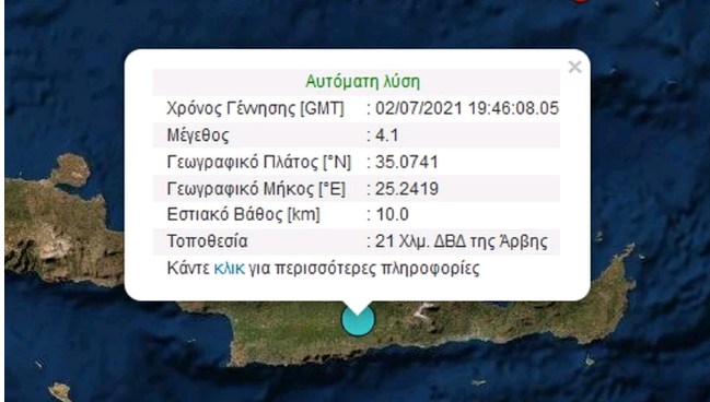 Σεισμός μεγέθους 4,1 βαθμών της κλίμακας Ρίχτερ ταρακούνησαν λίγο πριν τις 23:00 το βράδυ της Παρασκευής 2/7 την Κρήτη.