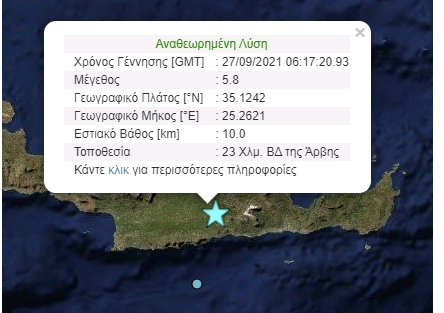 Ισχυρός σεισμός 5,8 ρίχτερ έγινε πριν από λίγο στο Ηράκλειο Κρήτης. Σύμφωνα με το Γεωδυναμικό το εστιακό βάθος είναι 5 χιλιόμετρα.