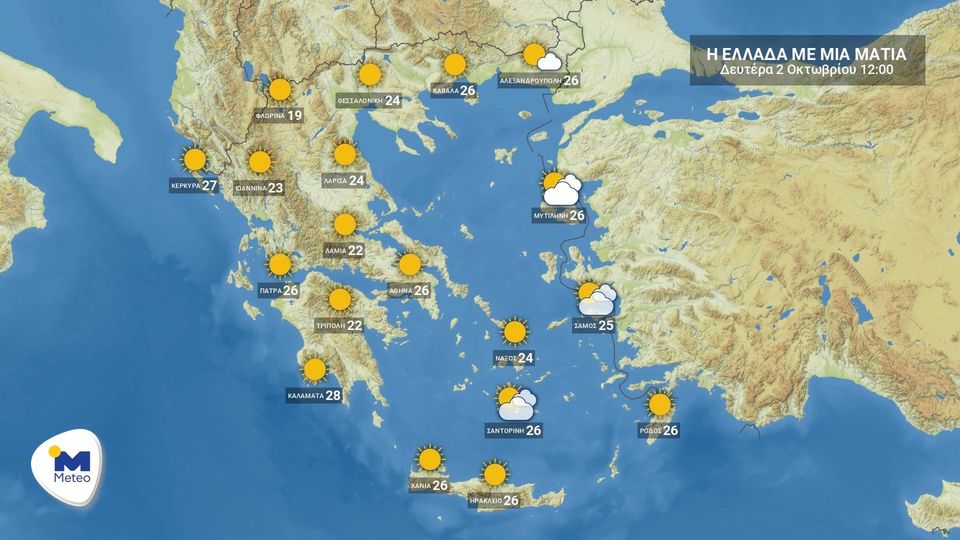 Θερμοκρασία: Από 13 έως 28 βαθμούς Κελσίου και στη δυτική Μακεδονία 3 με 5 βαθμούς χαμηλότερη.