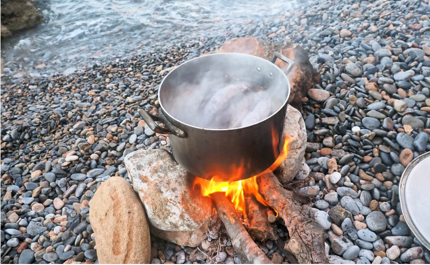Κάποιοι πιστεύουν ότι το ελαιόλαδο είναι καλύτερα να μπαίνει στο τέλος, και άλλοι –ίσως οι περισσότεροι– στην αρχή, μαζί με τα πρώτα υλικά που θα στηθούν στη φωτιά. Εμείς στήνουμε το τσουκάλι με το ελαιόλαδο στο αυτοσχέδιο «κούμιλο», θερμαίνεται και τσιγαρίζουμε μέσα σε αυτό το κρεμμύδι κομμένο φέτες, τις πατάτες, το σέλινο και τις ντομάτες αδρά τεμαχισμένες, και καρυκεύουμε με πιπέρι. Μετά προσθέτουμε το γλυκό και το θαλασσινό νερό, υπολογίζοντας να έρθει «ίσα βάρκα, ίσα νερά» με τα ψάρια που θα βάλουμε μετά, όταν τα κηπευτικά θα έχουν σχεδόν μαγειρευτεί.