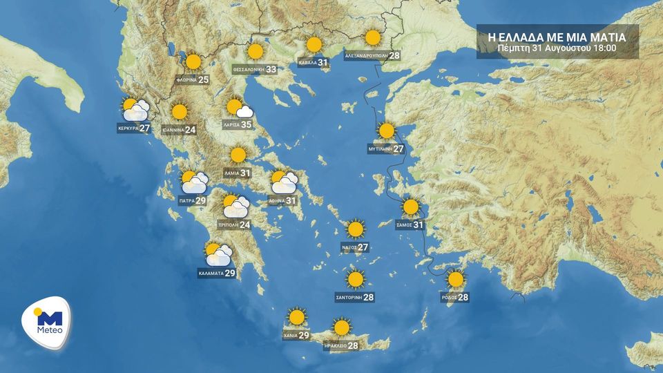 Αίθριος ο καιρός στο μεγαλύτερο μέρος της χώρας για σήμερα, Πέμπτη 31/08, με τοπικές και παροδικές νεφώσεις και μικρή πιθανότητα για τοπικές βροχές στα δυτικά ορεινά κυρίως. Υψηλή και τοπικά πολύ υψηλή επικινδυνότητα εκδήλωσης και εξάπλωσης δασικών πυρκαγιών σε περιοχές της ανατολικής και νότιας κυρίως χώρας.