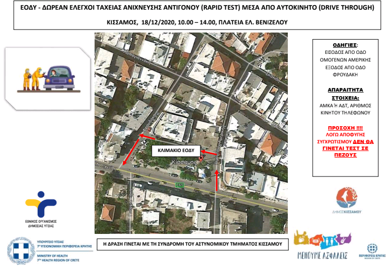 Την Παρασκευή 18-12-2020 θα πραγματοποιηθούν στο Καστέλλι Κισάμου έλεγχοι ταχείας ανίχνευσης αντιγόνου Covid-19 (rapid test) μέσα από αυτοκίνητο (drive through) από κλιμάκιο του ΕΟΔΥ.