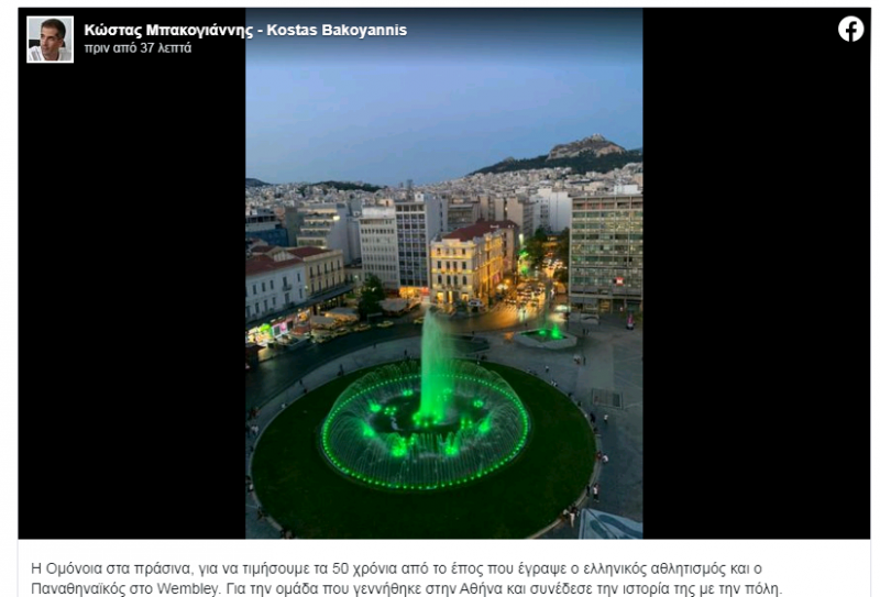 Με ανάρτησή του, ο δήμαρχος της πρωτεύουσας, Κώστας Μπακογιάννης, αναφέρει: «Η Ομόνοια στα πράσινα, για να τιμήσουμε τα 50 χρόνια από το έπος που έγραψε ο ελληνικός αθλητισμός και ο Παναθηναϊκός στο Wembley. Για την ομάδα που γεννήθηκε στην Αθήνα και συνέδεσε την ιστορία της με την πόλη».