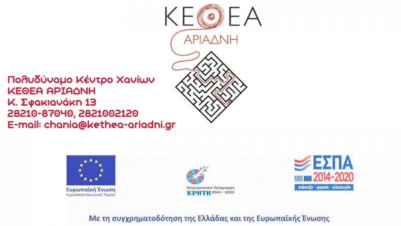 Μέσω του Επιχειρησιακού Προγράμματος ΕΣΠΑ “Κρήτη” 2014- 2020, με τη συγχρηματοδότηση του Ευρωπαϊκού Κοινωνικού Ταμείου (ΕΚΤ) και με προϋπολογισμό 204.480 ευρώ, υλοποιήθηκε το Πολυδύναμο Κέντρο Περιφέρειας Κρήτης του ΚΕΘΕΑ ΑΡΙΑΔΝΗ, με έδρα τα Χανιά.