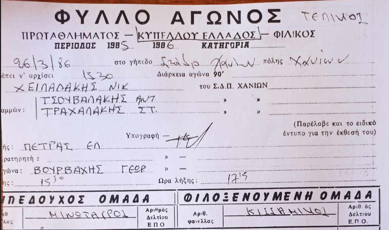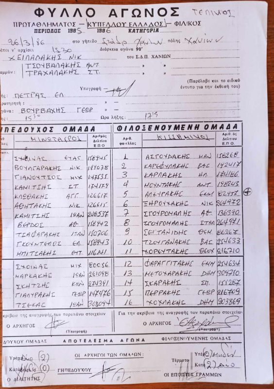 Το neoiorizontes.gr παρουσιάζει σήμερα το φύλλο αγώνα του τελικού εκείνου που έγινε στο Στάδιο Χανίων. Ευχαριστούμε θερμά τον δημοσιογράφο Γιώργο Δρακάκη που μας διέθεσε το φύλλο αγώνα από το πλούσιο αρχείο του.