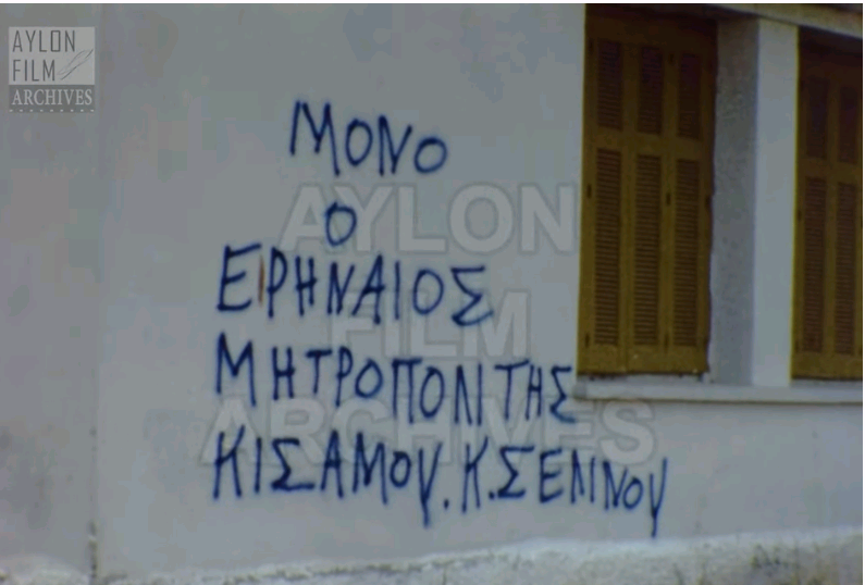 Ένας ιερέας στέκεται έξω απ’ το αυτοκίνητο και έπειτα βλέπουμε κόσμο συγκεντρωμένο έξω από μία εκκλησία Η εικόνα αλλάζει με τον κινηματογραφιστή να στέκεται σ’ ένα σύνθημα που είναι γραμμένο στον τοίχο και γράφει «Μόνο ο Ειρηναίος Μητροπολίτης Κισάμου και Σελίνου».