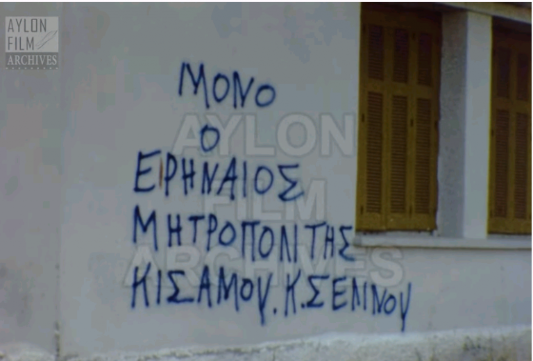 Ένας ιερέας στέκεται έξω απ’ το αυτοκίνητο και μετά βλέπουμε κόσμο συγκεντρωμένο έξω από μία εκκλησία Η εικόνα αλλάζει με τον κινηματογραφιστή να στέκεται σ’ ένα σύνθημα που είναι γραμμένο στον τοίχο και γράφει «Μόνο ο Ειρηναίος Μητροπολίτης Κισάμου και Σελίνου».