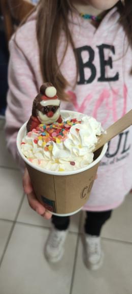 Μετά την ανάγνωση, γράψαμε τα δικά μας γράμματα στον Άγιο Βασίλη και φτιάξαμε τον χριστουγεννιάτικο φάκελό μας για να τα βάλουμε μέσα. Στο τέλος μας περίμενε και μια δεύτερη, ζεστή έκπληξη: μια κούπα μοσχομυριστή σοκολάτα με αφράτη σαντιγί και μπόλικη τρούφα, για να κλείσει η στιγμή γλυκά, με θαλπωρή και χαμόγελα, όπως ακριβώς ταιριάζει στα Χριστούγεννα!
