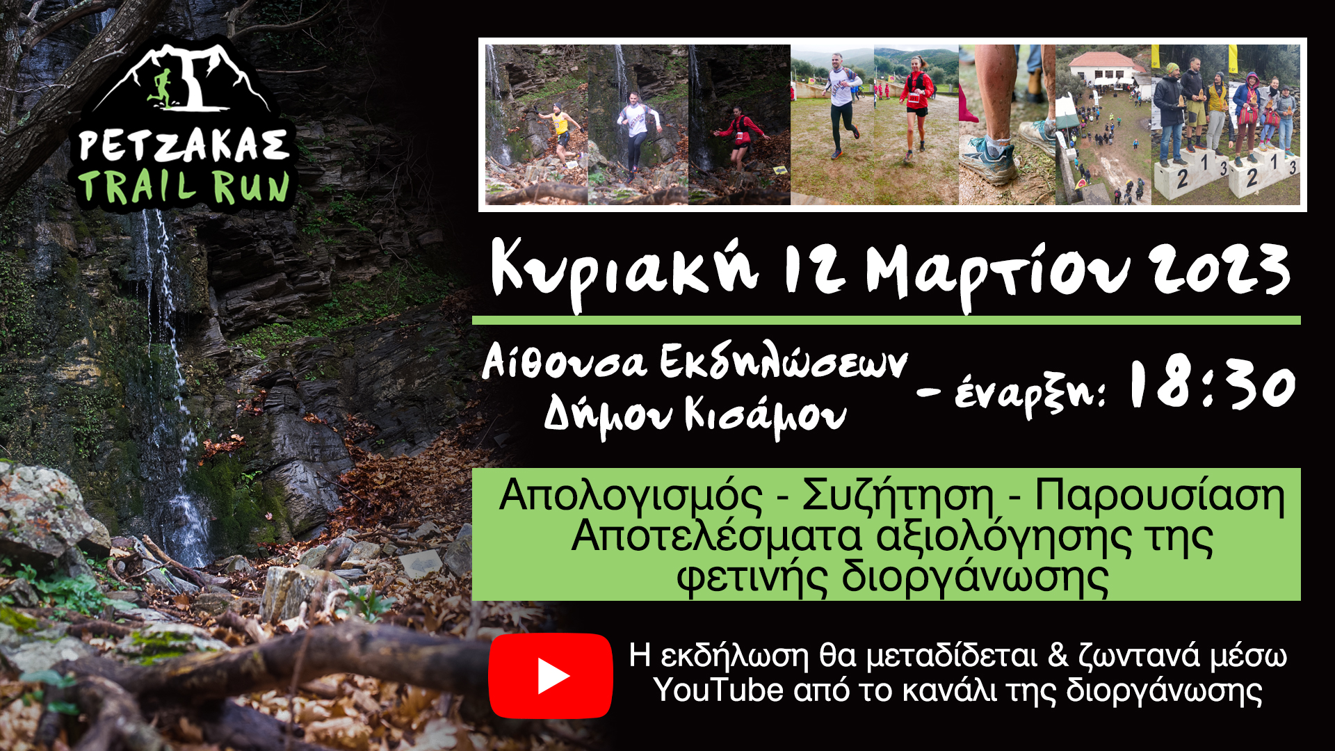 Περίπου ένα μήνα μετά την ολοκλήρωση της 2ης διοργάνωσης του “Ρέτζακας Trail Run 2023” και εμείς σαν οργανωτική ομάδα του αγώνα δεν σταματάμε εδώ. Συνεχίζουμε με μια ανοιχτή συνάντηση την Κυριακή 12 Μαρτίου 2022 στις 18:30 μ.μ. στην αίθουσα εκδηλώσεων του Δήμου Κισάμου. Θα πραγματοποιηθεί ένας απολογισμός και συζήτηση για την διοργάνωση που έφυγε αλλά και συζήτηση για το μέλλον. Θα γίνει η παρουσίαση της φετινής αξιολόγησης του Ρέτζακας Trail Run 2023 όπως επίσης θα τιμήσουμε τους συλλόγους και ομάδες εθελοντών που βοήθησαν στην διεξαγωγή της φετινής μας διοργάνωσης.