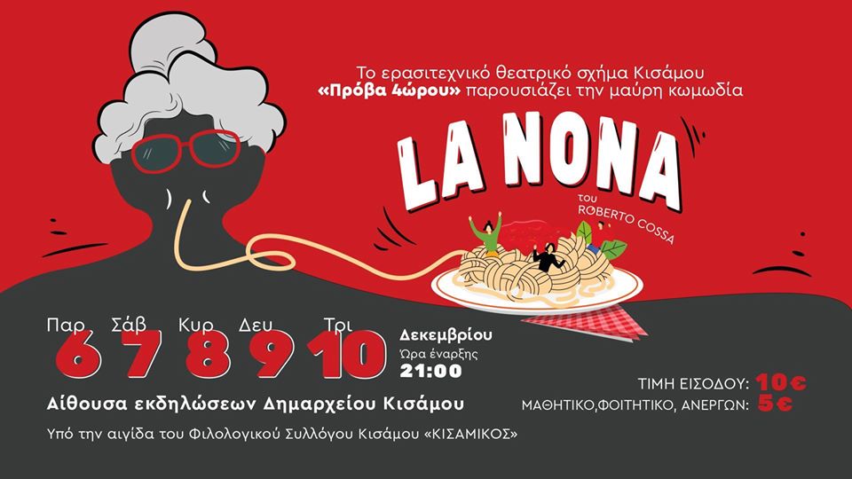 Την παράσταση παρουσιάζει το ερασιτεχνικό θεατρικό σχήμα «Πρόβα 4ώρου» που τελεί υπό την αιγίδα του Φιλολογικού Συλλόγου Κισάμου.