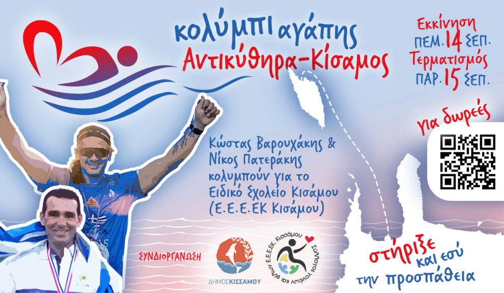 Ο Δήμος Κισάμου και το Διοικητικό Συμβούλιο του Συλλόγου Γονέων & Φίλων του Ε.Ε.Ε.ΕΚ. Κισάμου ανακοινώνουν την συνδιοργάνωση της δράσης κολύμβησης ανοιχτής θαλάσσης «Αντικύθηρα – Κίσαμος», που θα πραγματοποιηθεί στις 14 και 15 Σεπτεμβρίου 2023, με σκοπό την συλλογή χρημάτων για την στήριξη των αναγκών του ειδικού σχολείου.