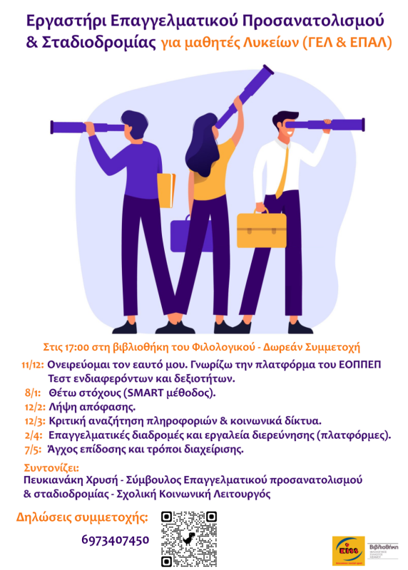 Το Εργαστήριο Επαγγελματικού Προσανατολισμού & Σταδιοδρομίας για μαθητές Λυκείων (ΓΕΛ & ΕΠΑΛ) ξεκινά τις συναντήσεις του τον Δεκέμβριο (κάθε 2η Πέμπτη του μήνα) στη Βιβλιοθήκη του Φιλολογικού Συλλόγου Κισάμου.