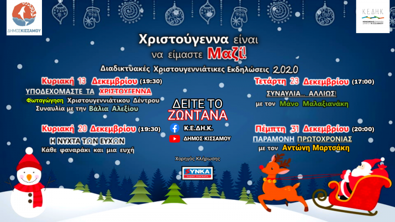 Η Κίσαμος καλωσορίζει τα Χριστούγεννα με τη Φωταγώγηση του Χριστουγεννιάτικου δέντρου. Τραγουδάμε, Χορεύουμε και Διασκεδάζουμε με την Βάλια Αλεξίου. Η εκδήλωση θα μεταδοθεί με live streaming κατά τη διάρκεια της οποίας οι θεατές θα μπορούν να στέλνουν τις ευχές τους από το fb , λαμβάνοντας μέρος στη κλήρωση η οποία θα πραγματοποιηθεί στην επόμενη διαδικτυακή εκδήλωση 20/12/20, την νύχτα των ευχών, όπου τρεις τυχεροί θα κερδίσουν δωροεπιταγές αξίας 100 ευρώ η καθεμία , προσφορά των σουπερ μάρκετ ΣΥΝΚΑ.