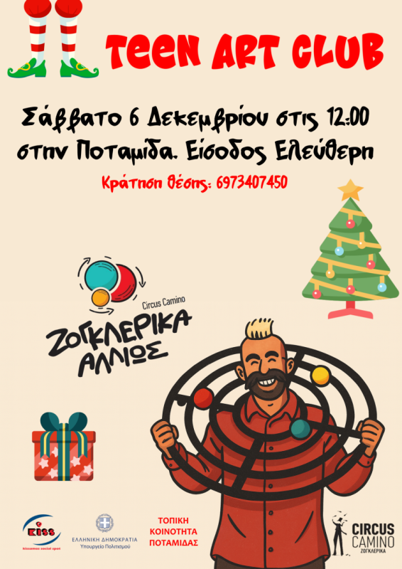 Ο εθελοντικός Σύλλογος Σημείο Κοινωνικών Δράσεων Κισάμου – KISS (Kissamos Social Spot) παρουσιάζει το διαδραστικό εργαστήριο «Ζογκλερικά Αλλιώς» με τον Circus Camino, στο πλαίσιο του προγράμματος «Πολιτιστικές Δράσεις και Προγράμματα για Παιδιά και Εφήβους (έως 18 ετών)», υπό την αιγίδα του Υπουργείου Πολιτισμού, υλοποιώντας τη δράση TEEN ART CLUB.