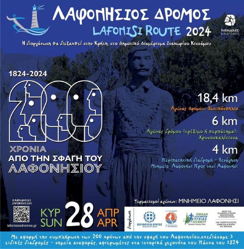 Την Κυριακή των Βαΐων, 28 Απριλίου 2024, στο Λαφονήσι Κισάμου νομού Χανίων, τρέχουμε και περπατάμε τη διαδρομή των προγόνων μας. Με αφορμή την συμπλήρωση 200 χρόνων από την σφαγή του Λαφονησίου, σχεδιάσαμε τρεις ιστορικες διαδρομές με ισχυρούς συμβολισμού.