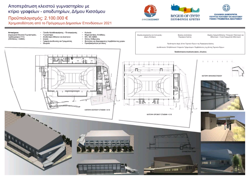 Δημοπρατήθηκε στις 22 Ιουνίου 2022 η “ΑΠΟΠΕΡΑΤΩΣΗ ΚΛΕΙΣΤΟΥ ΓΥΜΝΑΣΤΗΡΙΟΥ ΜΕ ΚΤΙΡΙΟ ΓΡΑΦΕΙΩΝ-ΑΠΟΔΥΤΗΡΙΩΝ ΔΗΜΟΥ ΚΙΣΑΜΟΥ», ένα έργο πνοής για τον Δήμο Κισάμου.