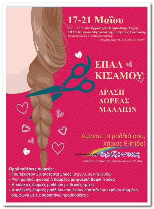 Το ΕΠΑΛ Κισάμου – Μητροπολίτης Ειρηναίος Γαλανάκηςσε συνεργασία με το σύλλογο εθελοντικής προσφοράς και στήριξης «ΟΡΙΖΟΝΤΑΣ», οργανώνουν εθελοντική δράση δωρεάς μαλλιώνγια τη δημιουργία περουκών, για παιδιά και ενήλικεςπου το έχουν ανάγκηκατά το στάδιο της χημειοθεραπείας.