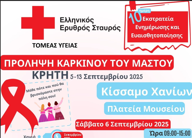 Ο Ελληνικός Ερυθρός Σταυρός (ΕΕΣ), στο πλαίσιο των δράσεων του για την προαγωγή της υγείας και την ενίσχυση της πρόληψης, διοργανώνει δράση το Σάββατο 6 Σεπτεμβρίου, από τις 9 το πρωί μέχρι τις 3 το μεσημέρι, στην πλατεία Μουσείου στο Καστέλλι Κισάμου.