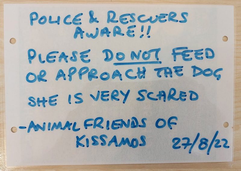 Οι Φιλόζωοι Κισάμου -μαζί με την αστυνομία, τον δήμο, την κτηνιατρική και τη βοήθεια φαρμακείου- σχεδίαζαν να ναρκώσουν το σκυλί αύριο και να το μεταφέρουν σε ασφαλές μέρος. Σήμερα το πρωί όμως ο αντιδήμαρχος Γιάννης Κελαΐδης διαπίστωσε ότι επαγγελματίας εκπαιδευτής σκύλων στα Χανιά (με τον οποίο είχε μιλήσει την Παρασκευή αλλά ήταν σε διακοπές) ήταν πλέον διαθέσιμος, και ήρθε αμέσως να την βγάλει από τον αυτοκινητόδρομο και να την φέρει σε μια ελιά.