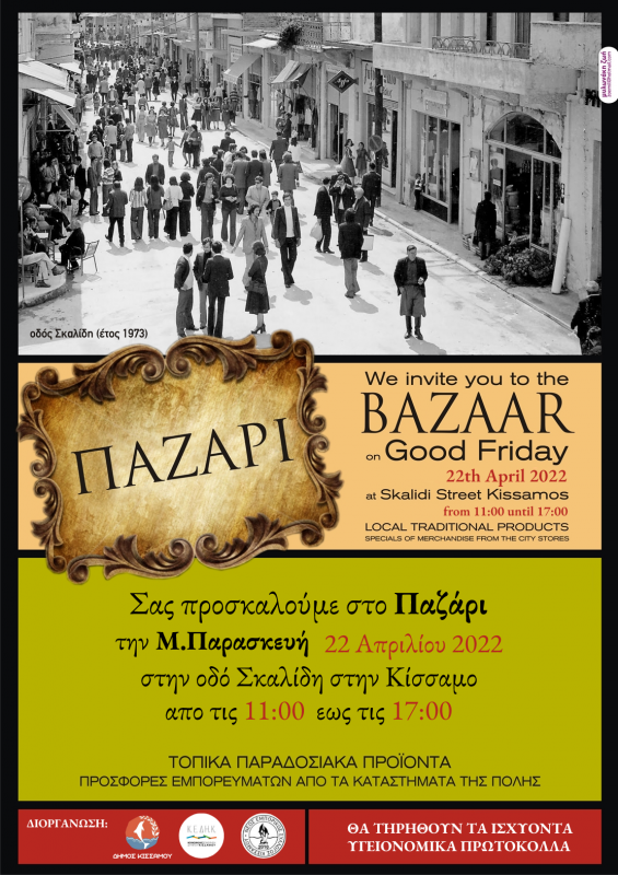 Ο Δήμος Κισάμου, η Κοινωφελής Επιχείρηση του Δήμου Κισάμου και ο Νέος Εμπορικός Σύλλογος Κισάμου, σας προσκαλούν να συμμετάσχετε στο Παζάρι της Μεγάλης Παρασκευής, το οποίο μετά από απουσία δύο χρόνων, θα πραγματοποιηθεί στην οδό Σκαλίδη, στις 22 Απριλίου.