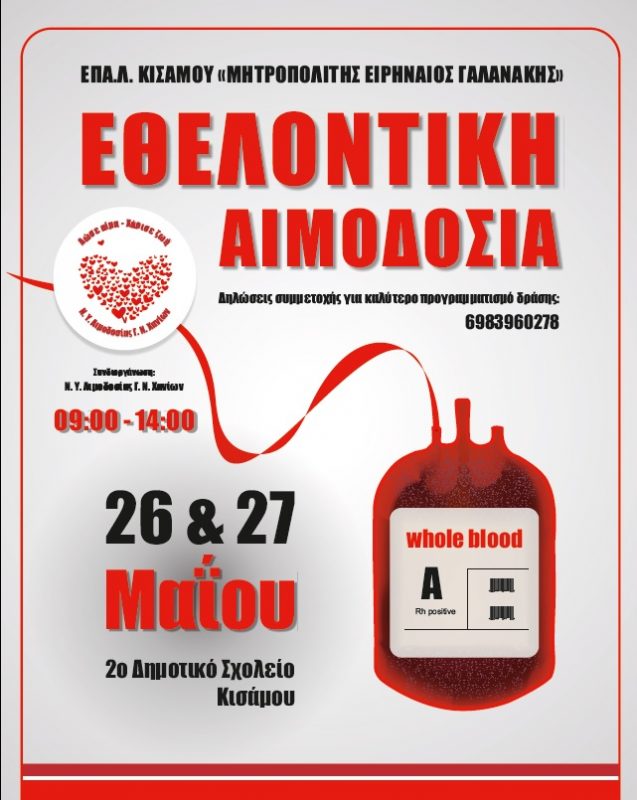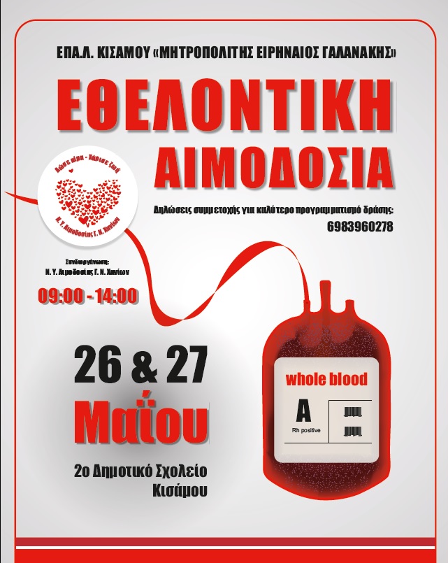 Εθελοντική αιμοδοσία διοργανώνει την Τρίτη 26 και την Τετάρτη 27 Μαΐου το ΕΠΑΛ Κισάμου “Μητροπολίτης Ειρηναίος Γαλανάκης”, σε συνεργασία με το τμήμα αιμοδόσίας του Νοσοκομείου Χανίων.