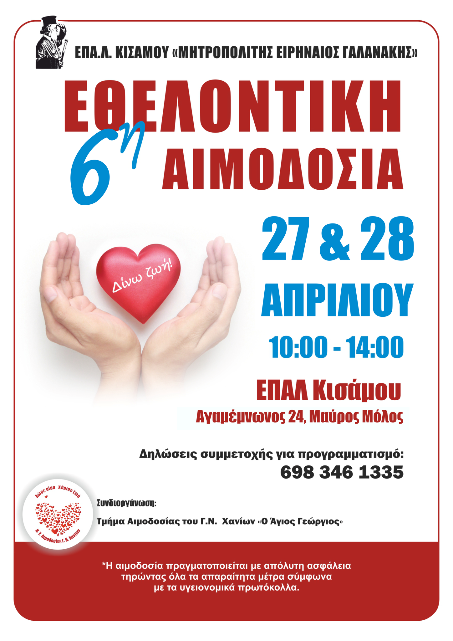 Την Πέμπτη 27 και Παρασκευή 28 Απριλίου και ώρες από 10 π.μ. έως 2 μ.μ. ο Σύλλογος Αιμοδοτών/ Διδασκόντων ΕΠΑΛ Κισάμου «Μητροπολίτης Ειρηναίος Γαλανάκης» διοργανώνει, για 6η συνεχή χρονιά, την καθιερωμένη ετήσια εθελοντική αιμοδοσία του. Στόχος της δράσης, που θα πραγματοποιηθεί σε συνεργασία με το τμήμα Αιμοδοσίας του Γ.Ν. Χανίων «Ο Άγιος Γεώργιος», στο χώρο προσωρινής στέγασης του ΕΠΑΛ Κισάμου στην περιοχή Μαύρος Μόλος (Αγαμέμνονος 24), είναι η ανάπτυξη της εθελοντικής αιμοδοτικής συνείδησης και του αισθήματος της κοινωνικής αλληλεγγύης στους νέους της Κισάμου.