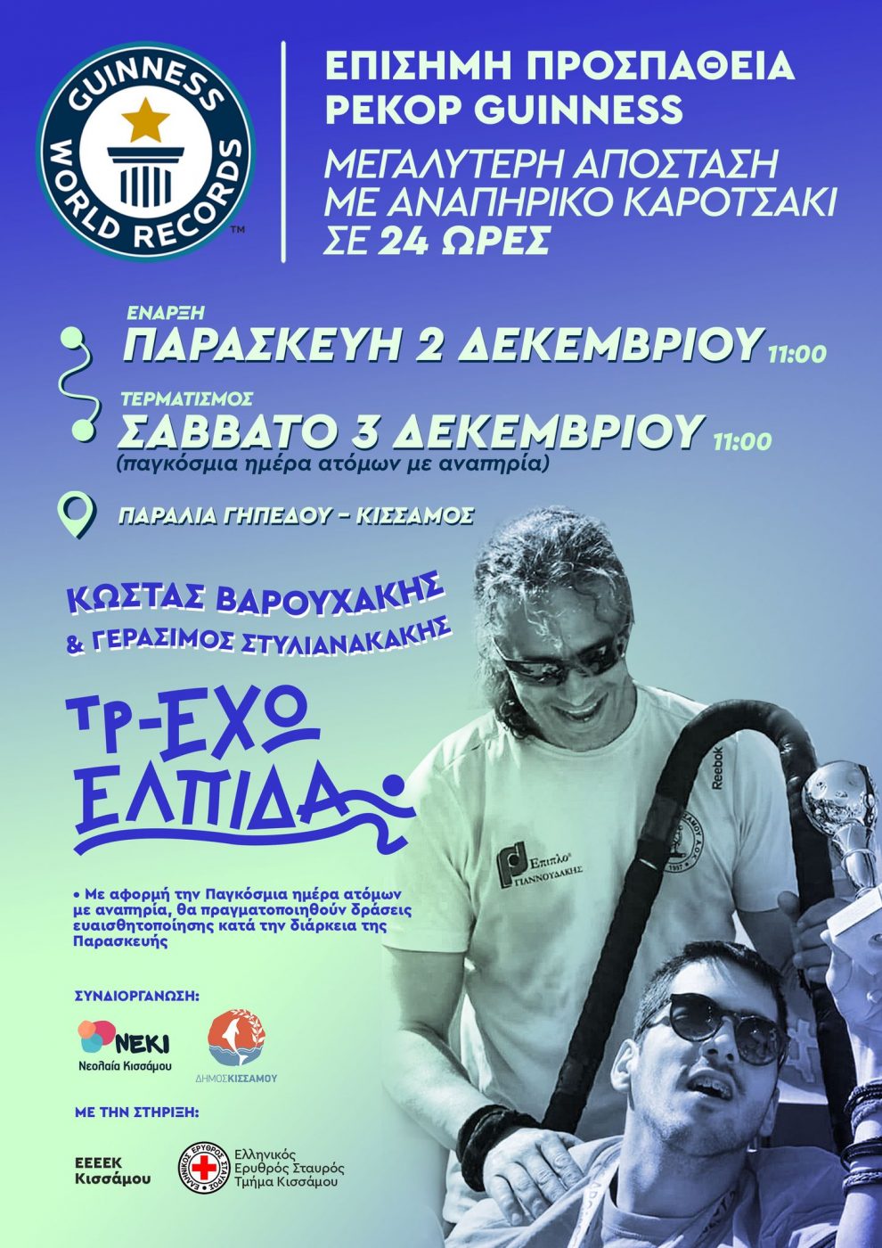 Η προσπάθεια τους θα λάβει χώρα σε κυκλική διαδρομή στην Παραλία Γηπέδου στην Κίσαμο, ενώ παράλληλες εκδηλώσεις θα πραγματοποιηθούν την Παρασκευή 2 Δεκεμβρίου το πρωί στον Δημοτικό Χώρο Στάθμευσης πριν την παραλία.