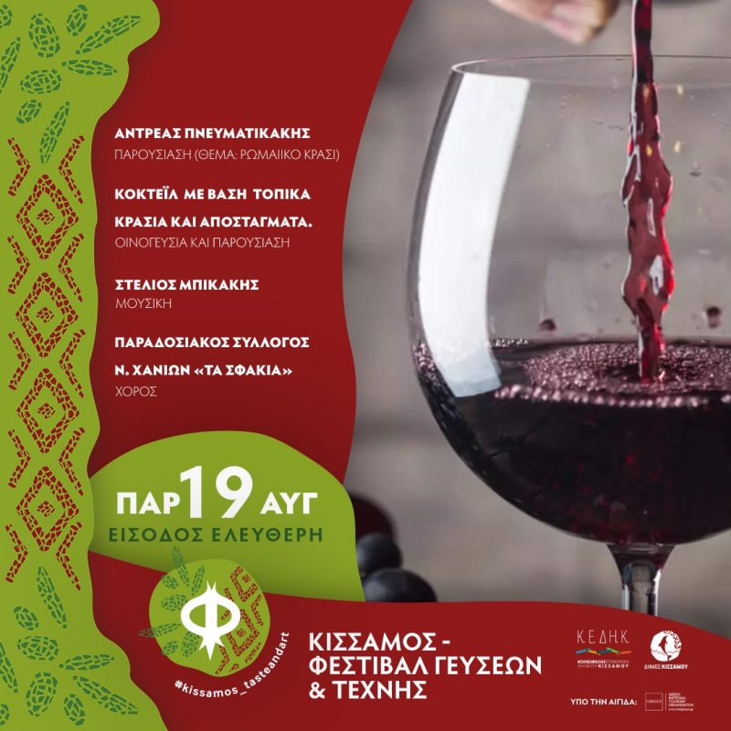 Τέταρτη μέρα σήμερα Παρασκευή 19 Αυγούστου στο Φεστιβάλ Γεύσεων και Τέχνης που διοργανώνει ο Δήμος και η Κοινωφελής Επιχείρηση Κισάμου και το σημερινό πρόγραμμα πεεριλαμβάνει: αναφορά στο Ρωμαίικο Κρασί Παρουσίαση: Ανδρέας Πνευματικάκης), Oινογευσία και παρουσίαση κοκτέιλ με βάση τα τοπικά κρασιά και αποστάγματα.